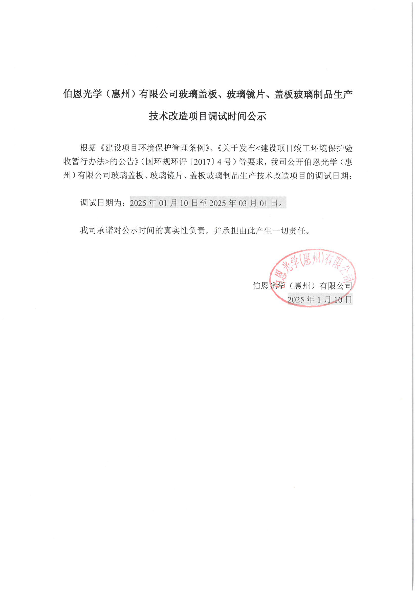 伯恩光学(惠州)有限公司玻璃盖板、玻璃镜片、盖板玻璃制品生产技术改造项目调试时间公示